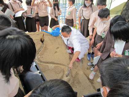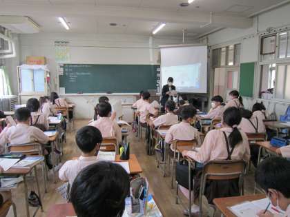 写真は、5年生の学習の様子です。1組は理科で、流れる水のはたらきを学習しています。2組は算数で、台形の面積の公式を学習しています。