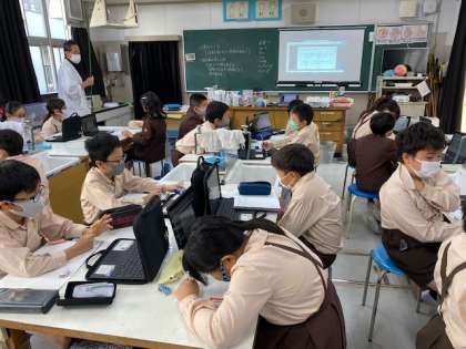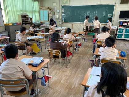 4年生1・2組の授業のようすです。1組は学活で、各係から連絡をしています。2組は理科で、「ヒト以外の動物の体のしくみや動くしくみ」について考えています。