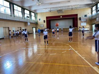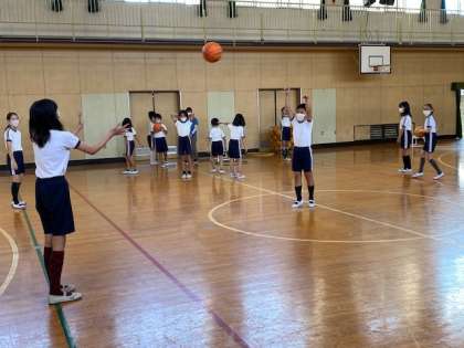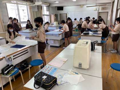 5年生1・2組の授業のようすです。1組は家庭科で、「エプロン作り」をしています。2組は体育で、「ポートボール」の練習をしています。