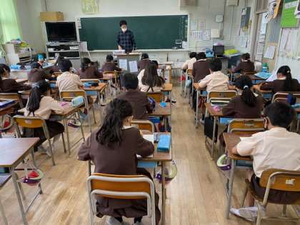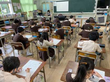 3年生1・2組の授業のようすです。どちらも算数で、「コンパスを使った学習」の単元のテストをしています。