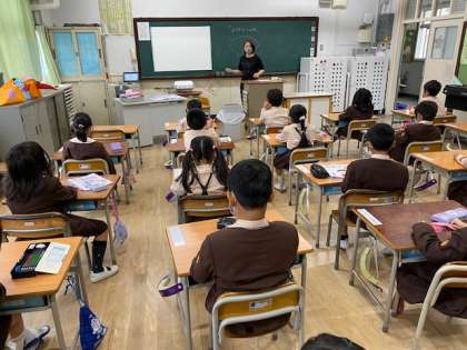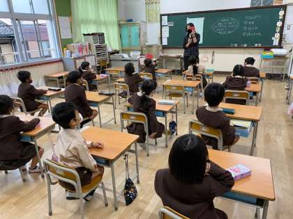 1年生1・2組の授業のようすです。どちらも学活で、全校オリエンテーリングの一貫として、6年生への「ありがとうの木」を作るために、一人ひとり葉っぱ型の紙にお礼を書いています。