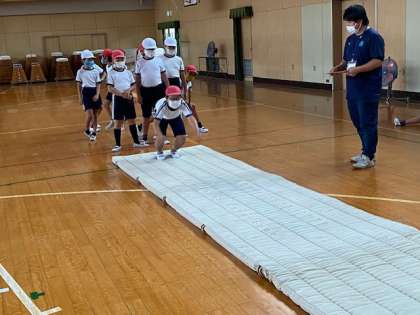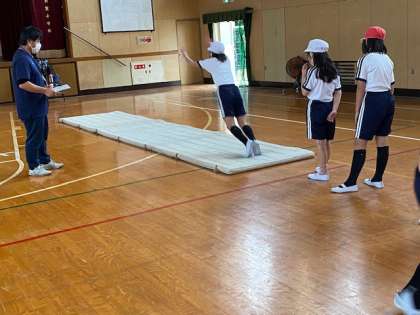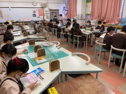 4年生1・2組の授業のようすです。1組は体育で、スポーツテストの「立ち幅跳び」の測定をしています。2組は図書の時間で、図書館で本を借りて読んでいます。