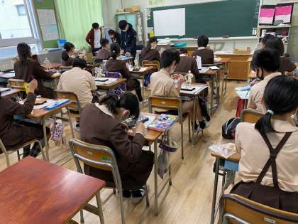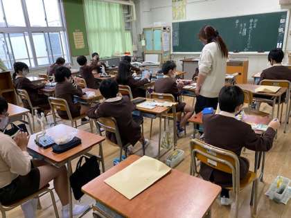 6年生1・2組の授業のようすです。どちらも図工で、ねんど芯材を使って、人間のさまざまな姿勢や状態の作品を作っています。