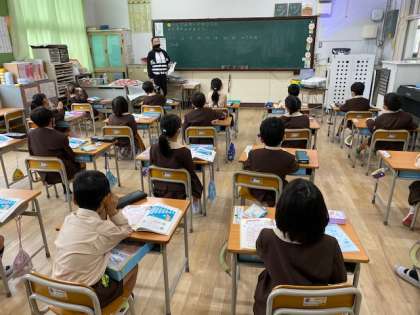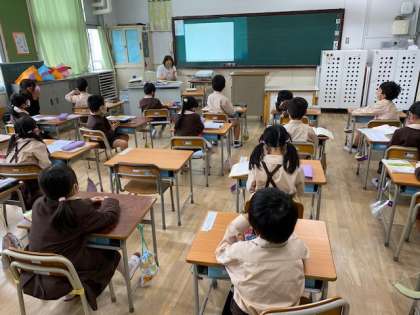 1年生1・2組の授業のようすです。どちらも算数で、1組は算数ドリルの答え合わせを、2組は「たし算カード」の仲間分けをしています。