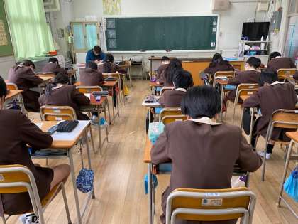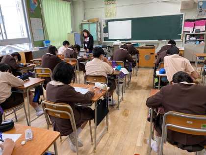 6年生1・2組の授業のようすです。どちらも算数で、「図形の拡大や縮小」の単元のテストをしています。