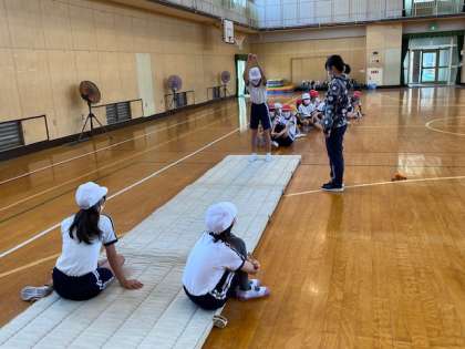 5年生1・2組の授業のようすです。1組は家庭科で、「エプロン作り」をしています。2組は体育で、「立ち幅跳び」の練習をしています。