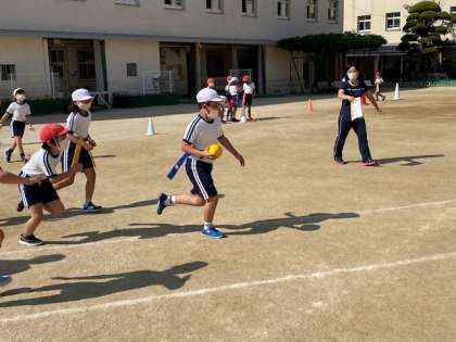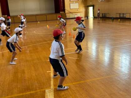3年生1・2組の授業のようすです。どちらも体育で、1組は体育館、2組は運動場で、「タグラグビー」の練習をしています。