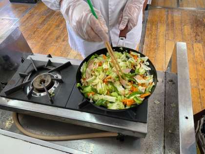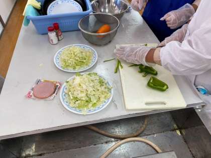 本日1・2時間目、6年2組は調理実習で「野菜いため」を作っています。