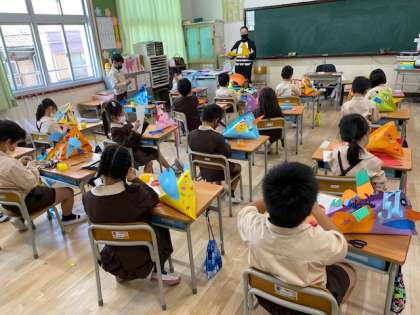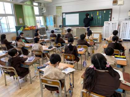 1年生1・2組の授業のようすです。1組は国語で、教育実習の先生が担当で「いろいろな ふね」の学習をしています。2組は図工で、立体作品作りをしています。