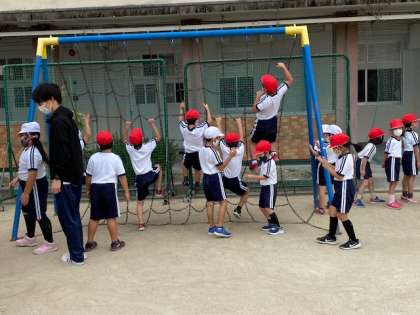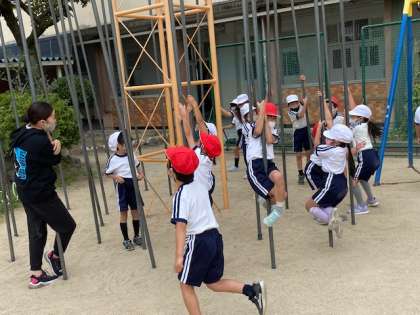1年生1・2組の授業のようすです。合同体育で、遊具を使ってトレーニングをしたり、鉄棒の練習をしたりしています。