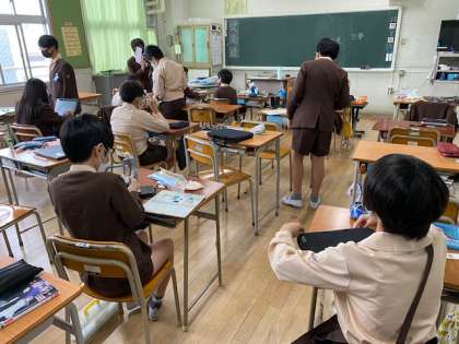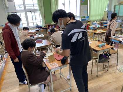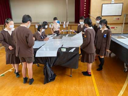 6年生1・2組の授業のようすです。どちらも図工で、立体作品の最後の仕上げや、できた人は展示の手伝いをしています。