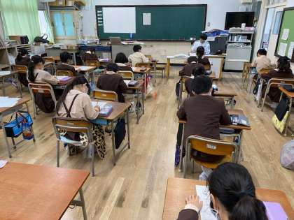 2年生1・2組の授業のようすです。1組は算数で、「かけ算」のテストに取り組んでいます。2組は学活で、さまざまな連絡をしています。