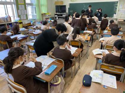 3年生1・2組の授業のようすです。どちらも算数で、「2ケタ×1ケタのかけ算の筆算」の練習問題に取り組んでいます。できた人から先生にチェックを受けています。