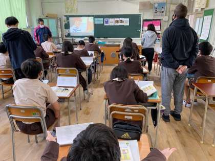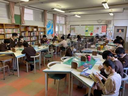 6年生1・2組の授業のようすです。1組は英語で、「We have 〜.」「We don't have〜」を使って、いろいろな施設についての質問に英語で答えたりしています。2組は図書の時間で、図書館で本を借りて読んでいます。