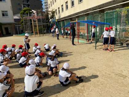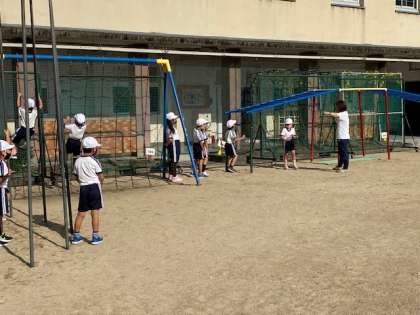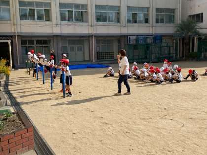 1年生1・2組の授業のようすです。合同体育で、遊具を使ってトレーニングをしたり、鉄棒の練習をしたりしています。