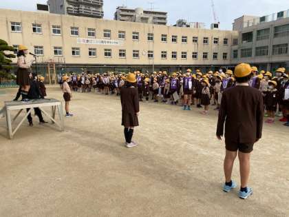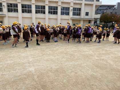 今日は、集会委員が「落〜ちた!落〜ちた!」ゲームをしてくれました。集会委員が「落〜ちた!落〜ちた!」と言うとみんなが「な〜にが落ちた」と言い、その後に集会委員がいろいろなものを言って、それをみんなで受け止めたり、避けたりします。先生や動物等いろいろなものが落ちて来て、とても楽しんでいました。