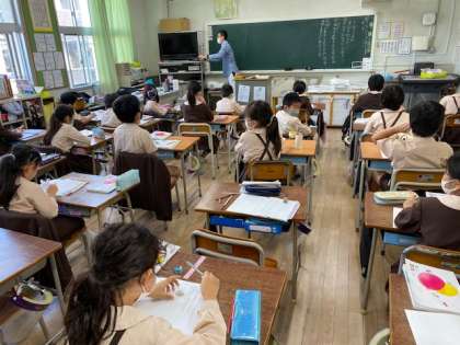 3年生1・2組の授業のようすです。どちらも国語で、1組は「漢字の音読みと訓読み」について学習しています。2組は漢字プリントに取り組んでいます。