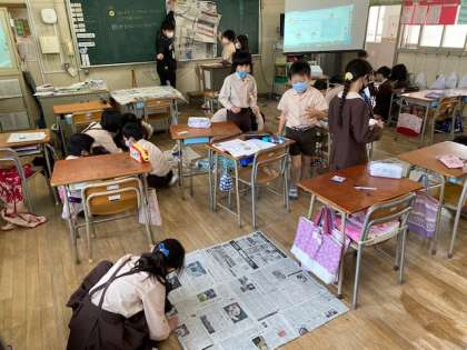 4年生1・2組の授業のようすです。1組は算数で、「1平方メートル」の大きさを新聞紙を使って表しています。2組は理科で、「空気の温度による体積の変化」を調べる実験をしています。