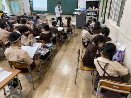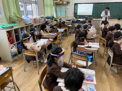 2年生1・2組の授業のようすです。2クラス合同の算数で、「本やノートの かどの形をしらべよう。」の学習をしています。教科書やノートの角を見て考えています。