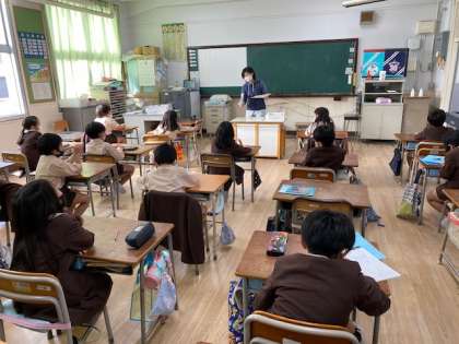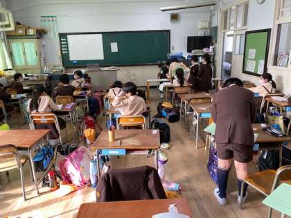2年生1・2組の授業のようすです。どちらも生活科で、「2がっきを ふりかえりましょう」のプリントにとりくんでいます。