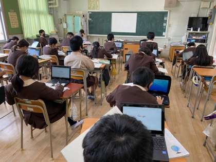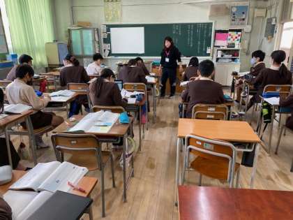 6年生1・2組の授業のようすです。どちらも国語で、「世界に向けて意見文を書こう」について学習に取り組んでいます。