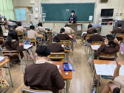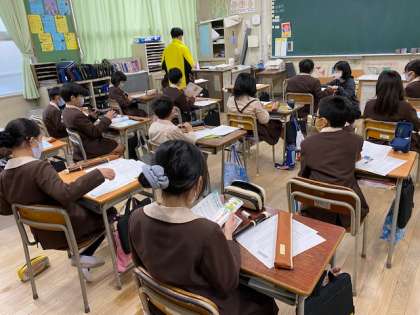 4年生1・2組の授業のようすです。1組は「経年調査」の「児童質問紙」に取り組んでいます。2組は音楽で、「とんび」の歌のリコーダーテストをするところです。