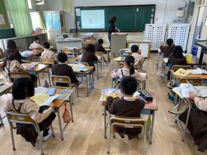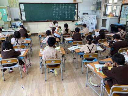 1年生1・2組の授業のようすです。どちらも国語で、「すきな おはなしは なにかな」ということで、好きな本を読んでまとめています。