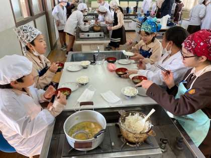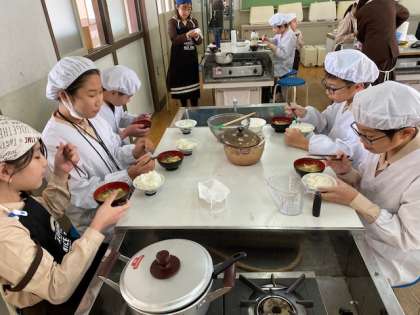 できあがった「ごはん」と「お味噌汁」を試食しています。