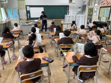 1年生1・2組の授業のようすです。どちらも国語で、1組は「すきなおはなしは なにかな」の学習をしています。2組は漢字テストをしています。