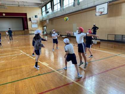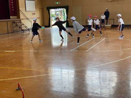 4年生1・2組の授業のようすです。1組は道徳で、「朝がくると」(身近なことへの感謝)について考えています。2組は体育で、「ポートボール」の試合をしています。