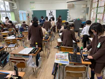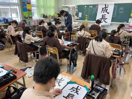 5年生1・2組の授業のようすです。どちらも書写で、「成長」を毛筆で書いています。