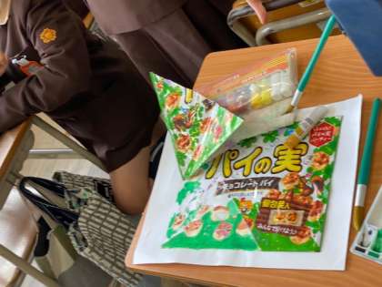 4年生1・2組の授業のようすです。1組は理科で、これまでに受けた6回分のテストを順番に返却してもらっています。2組は図工の時間で、市販のお菓子のパッケージの一部を紙に貼り、その足りない部分を自分で絵を描く作業をしています。