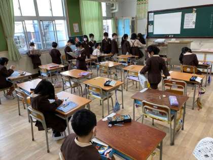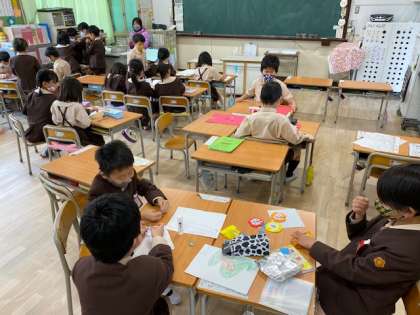 1年生1・2組の授業のようすです。どちらも学活で、1組は「こうつうあんぜんチャレンジ」の作文を書いています。2組は「お楽しみ会」のための準備をしています。