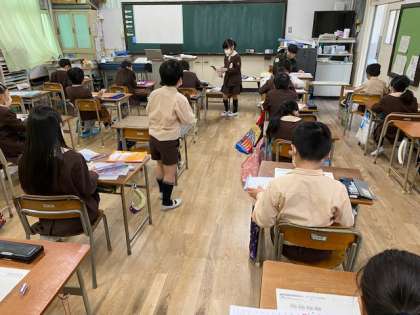 2年生1・2組の授業のようすです。どちらも算数で、1組はかけ算のプリント学習をしています。2組はグループで「九九」の問題の出し合いをしています。