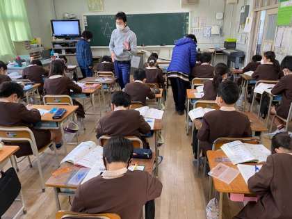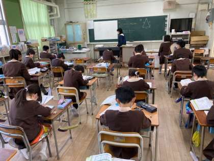 3年生1・2組の授業のようすです。どちらも算数で、「二等辺三角形」をコンパスを使って作図しています。