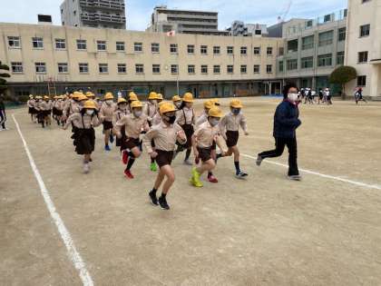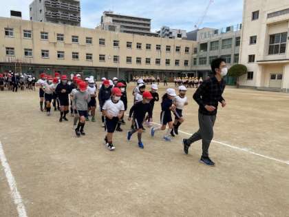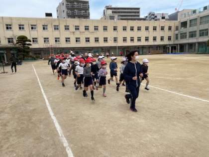 「耐寒かけ足」1日目、3時間目終了後の休み時間、中学年が走っているようすです。