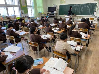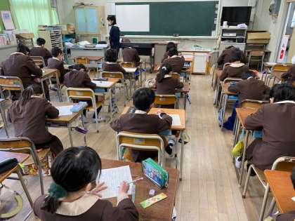 3年生1・2組の授業のようすです。どちらも国語で、1組は「心が動いたことを詩で表そう」の学習を、2組は「俳句に親しむ」の単元のテストをしています。