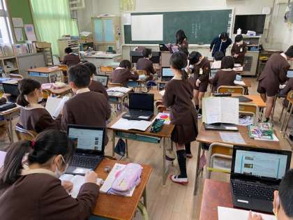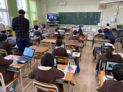 3年生1・2組の授業のようすです。どちらも国語で、「人をつつむ形-世界の家めぐり」の単元で、外国の家のつくりや沖縄・白川郷等の家のつくりなどについてまとめたり、タブレット端末を使って調べたりしています。