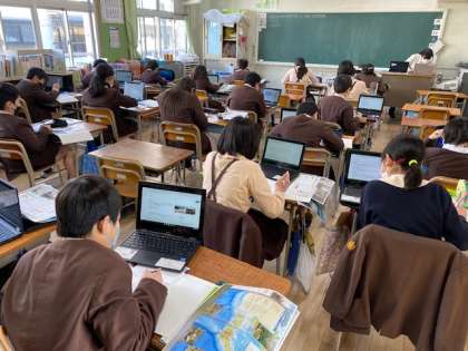 5年生1・2組の授業のようすです。どちらも社会で、「日本で起こる自然災害」について考えています。2組は4人の児童とオンラインでつないで、授業を進めています。