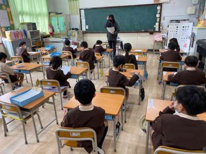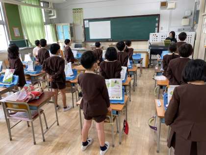 1年生1・2組の授業のようすです。1組は音楽で、「こいぬのマーチ」などの歌を歌っています。2組は学活で、入学式の「歓迎の言葉」の練習をしています。