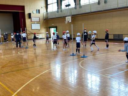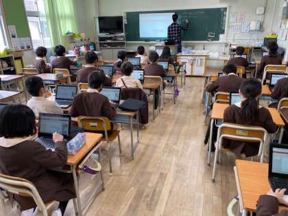 3年生1・2組の授業のようすです。1組は学活で、タブレット端末を使ってパワーポイントの使い方を学習しています。2組は体育で、ネット型のボールゲームをしています。