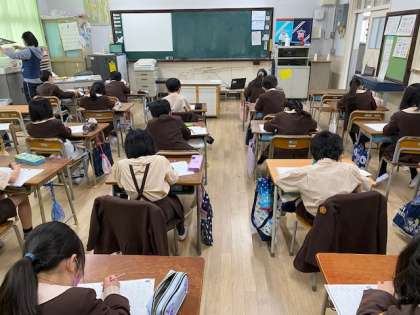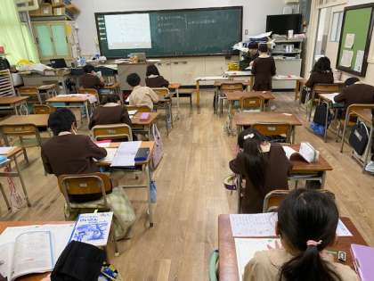 2年生1・2組の授業のようすです。1組は算数で、計算ドリルに取り組んでいます。2組は国語で、漢字プリントに取り組んでいます。