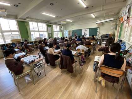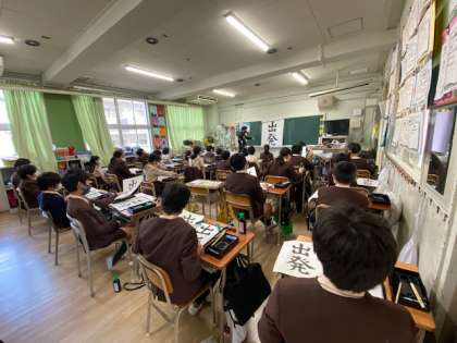5年生1・2組の授業のようすです。どちらも書写で、「出発」を毛筆で書いています。