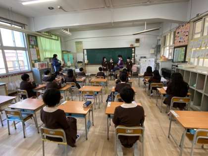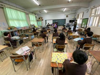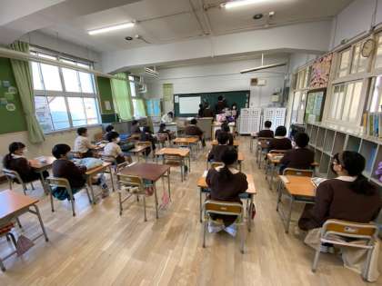 1年生から5年生だけで集まり、それぞれの班の6年生へのメッセージカードを書きました。
