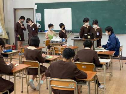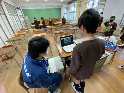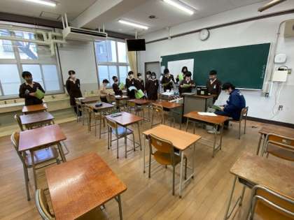 例年なら講堂に集合して一斉に行うのですが、新型コロナウイルスの感染防止のため、各教室に兄弟班で集まり、お互いに離れた机の上の別々の札を取り合い、早くとった方が得ることになります。