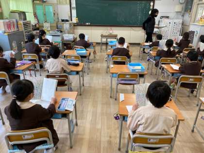 1年生1・2組の授業のようすです。どちらも国語で、「スイミー」のお話をみんなで音読しています。