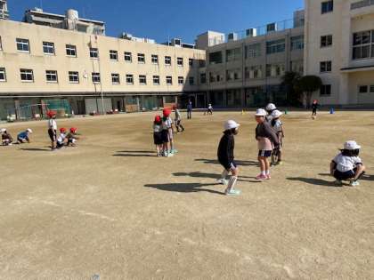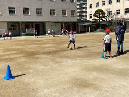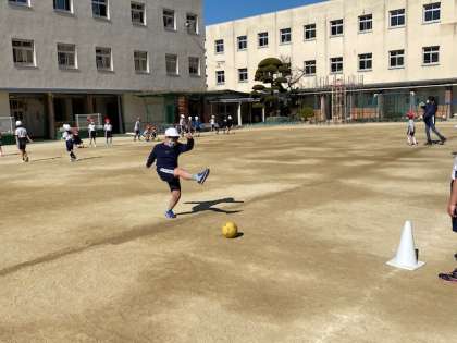 1年生1・2組の授業のようすです。合同体育で、サッカーのドリブルからシュートをする練習等をしています。