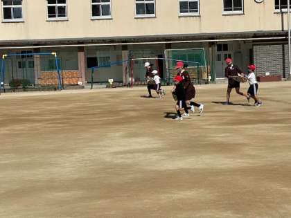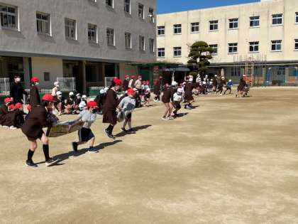 1組と2組がそれぞれ4班ずつに分かれて、6年生と1年生がペアを組みました。そのペアで新聞紙の上に学級ボールを乗せて運ぶ競争です。ペアでうまくボールを運びながらとても楽しく交流をすることができました。