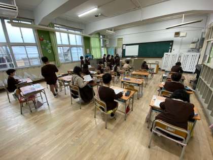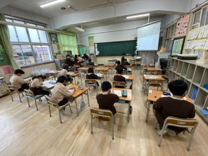1年生1・2組の授業のようすです。どちらも算数で、教科書の「もうすぐ2年生」の練習問題を解いています。