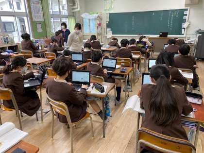 5年生1・2組の授業のようすです。どちら国語で、「手塚治虫」について生き方やどのような人だったかについて考えています。